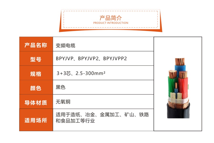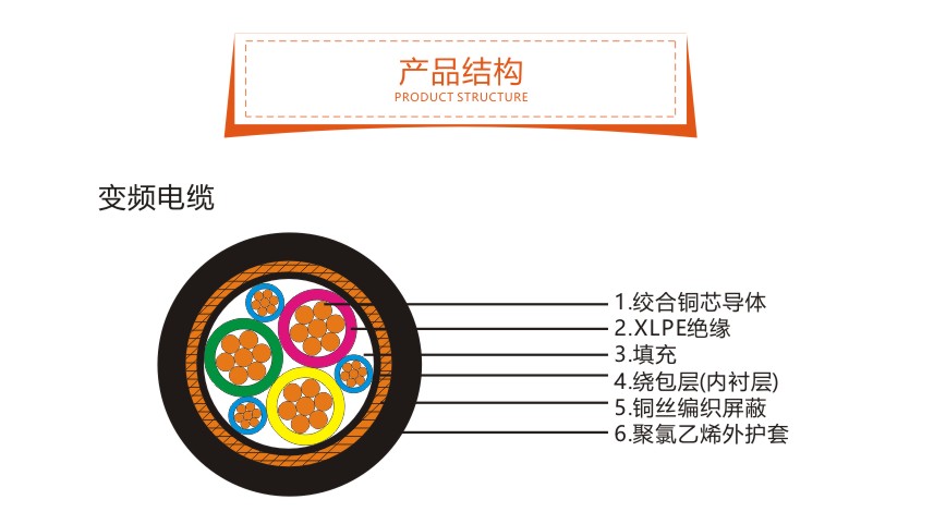 變頻電纜的結(jié)構(gòu)包括三根主線絕緣線、三根零線絕緣線,在主線絕緣線和零線絕緣線外依次設(shè)置內(nèi)繞包層、銅帶層、外繞包層和外護(hù)套層,形成3+3線芯結(jié)構(gòu),使電纜具有較強(qiáng)的耐電壓沖擊性,能經(jīng)受高速頻繁變頻時(shí)的脈沖電壓,對變頻電器起到良好的保護(hù)作用。